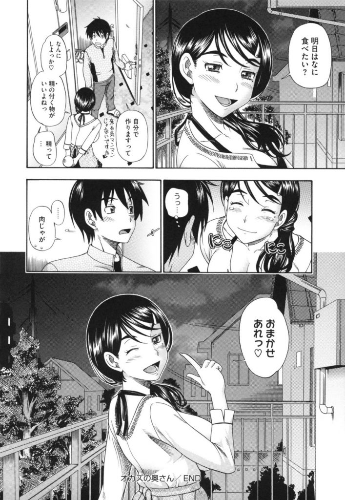 【エロ漫画】巨乳な人妻の管理人さんがあまったおかずを持ってきてそのままエッチwシックスナインの体勢でチンポをしゃぶってもらい、すっかり勃起したチンポを挿入して人妻のマンコに精子を抽入【フクダーダ:おかずの奥さん】