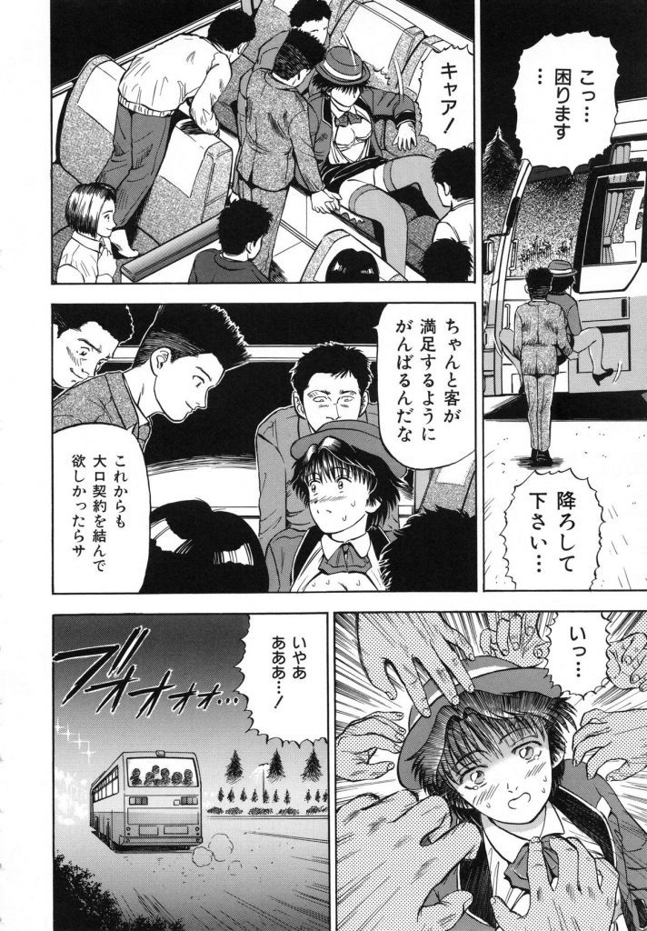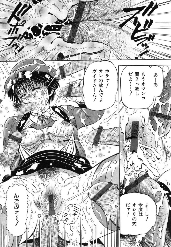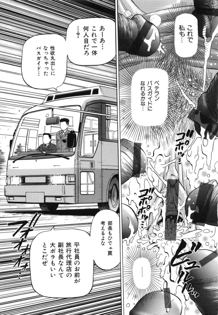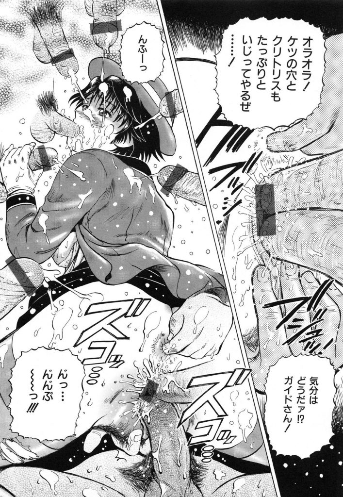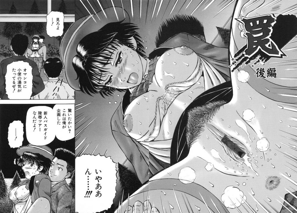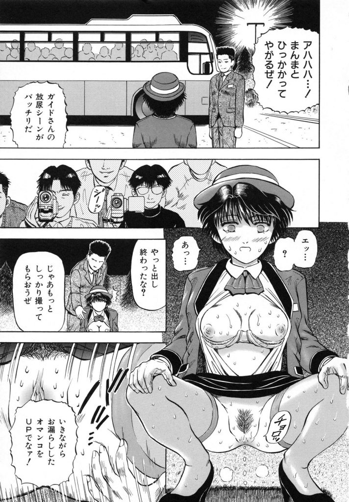 【エロ漫画】男たちに調教されちゃうバスガイドのお姉さん…放尿させられ2穴同時挿入で中出し輪姦レイプされちゃう【泉谷勇次:罠】