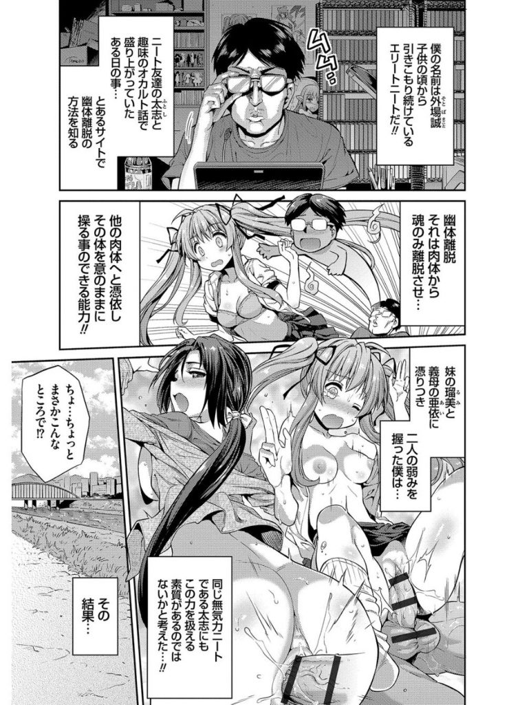 【エロ漫画】オタクの二人は幽体離脱を自由にできるようになると、母娘の身体を使って立ちションしたり好き放題していた!今日の目的はアダルトショップでエログッズを買わせることで、娘の身体を使ってエロ本を立ち読みすると店内でオナニーを始めさせる!母娘ともども裏に連れていかれると店長とバイトの男をエッチに誘ってレイプさせる!【日月ネコ:憑りつき☓乗っ取り☓孕ませろ!】