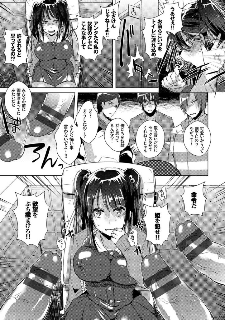 【エロ漫画】ゲーセンで横行を働いたあと、怒りを買った男子に催眠術で復讐された生意気オタサー姫…操られた取り巻きのオタクたちにトイレに押し込まれてイラマチオされ、お仕置き輪姦調教レイプで敗北アヘ絶頂堕ち【海老名えび:調子に乗ったオタサーの姫にオシオキしてやった件】