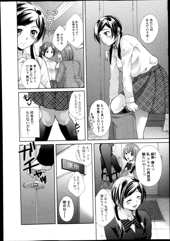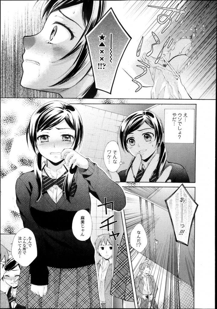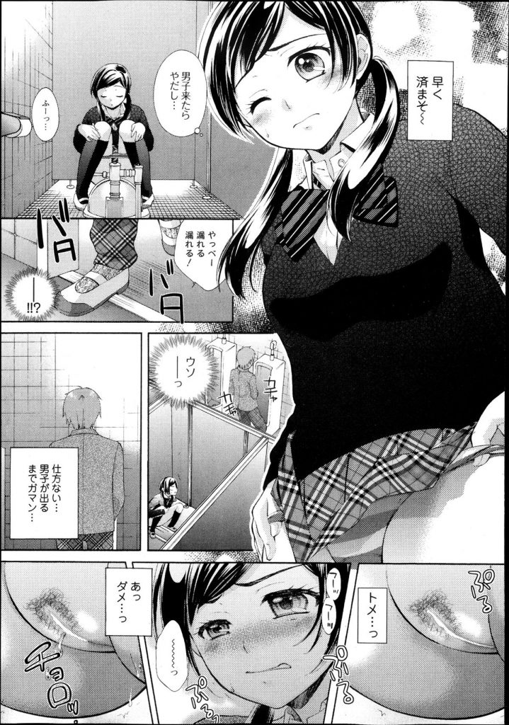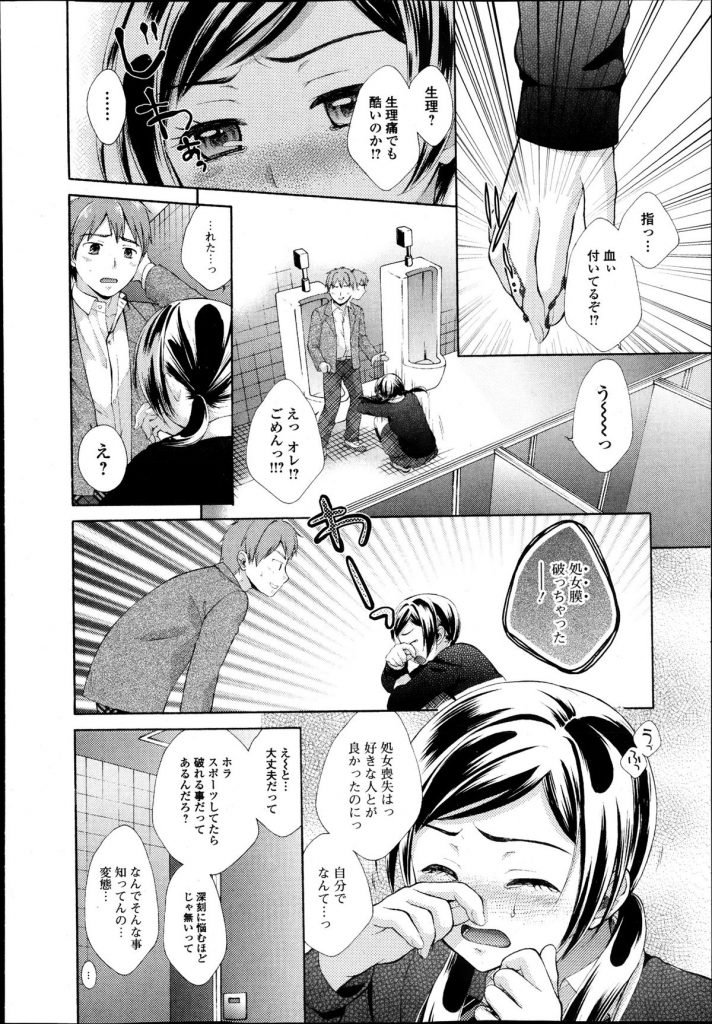 【エロ漫画】共同トイレでおしっこをすると男性が入ってきてびっくりして処女膜を自分で破ってしまったJK…彼に責任をとらせイチャラブセックスをして生ハメ中出し絶頂アクメ堕ちしちゃう【大貫まくり:おねホール】