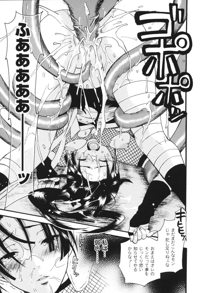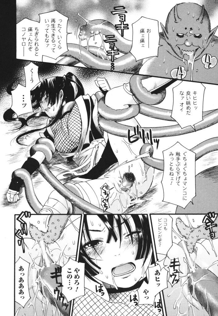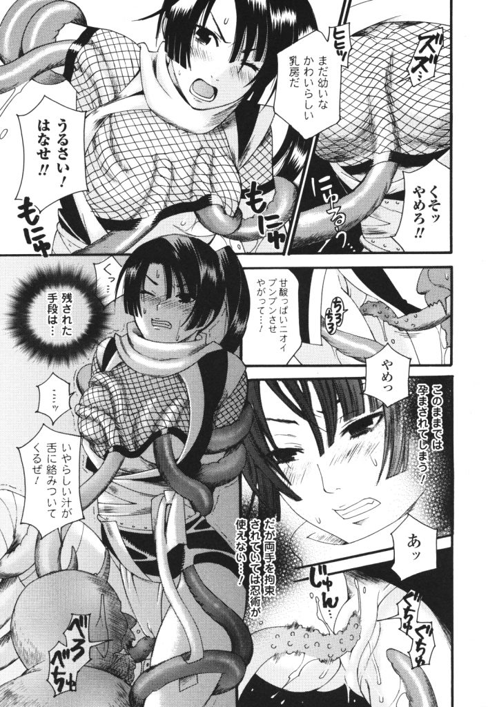【エロ漫画】女を弄び苗床にしている淫魔を退治する淫魔狩りくノ一…囚われた女性に変装した敵に欺かれ捕まってしまい、触手で囚われたまま根元までアソコに淫魔の汚いデカマラをぶち込まれ種付けされてしまう。【ウメ吉:淫魔ノ苗床】