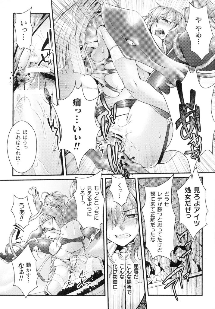 【エロ漫画】弱みを握られ地下闘技場で戦う爆乳美女が、相手の動く鎧からのびてきた触手で処女マンコを公開種付けレイプされてしまう!【ジンナイ:ダタではイかない】