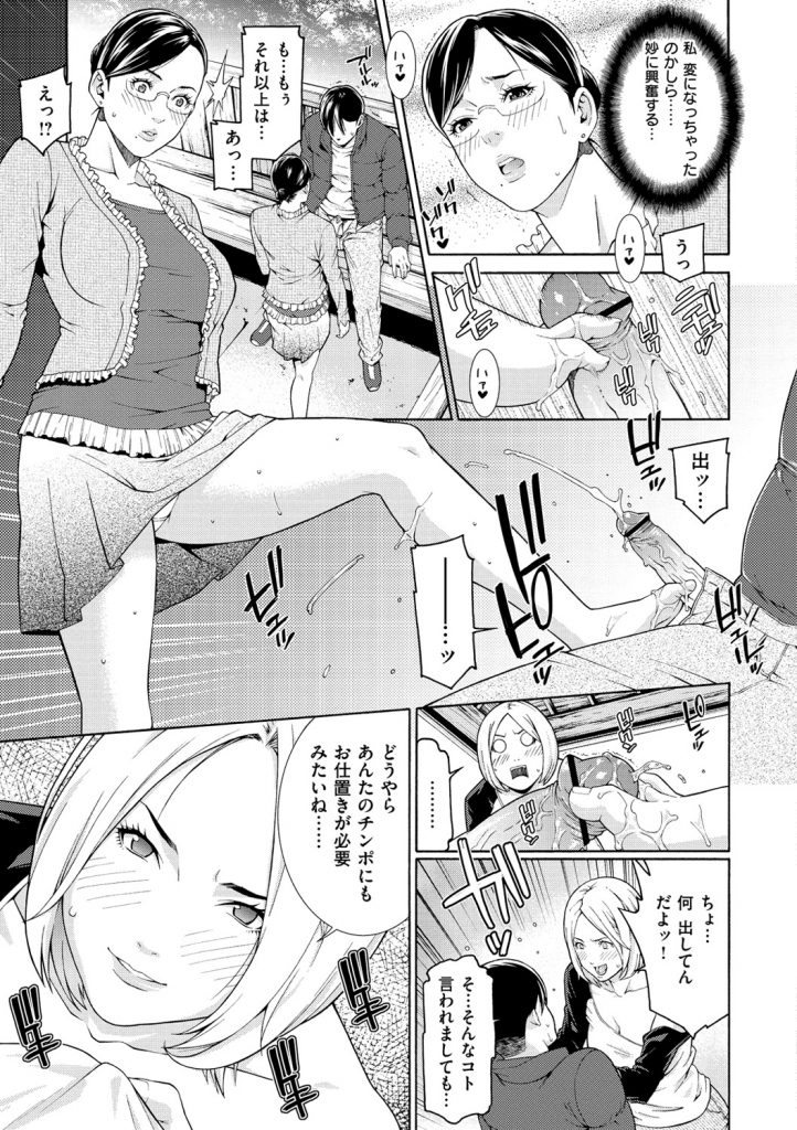 【エロ漫画】盗撮していた男にお仕置きしちゃうお姉さん…顔面騎乗位で生ハメ中出し3Pセックスしちゃう【終焉:淫フォーカス】