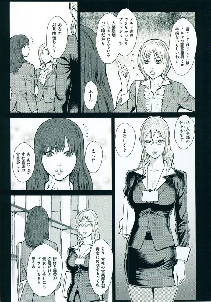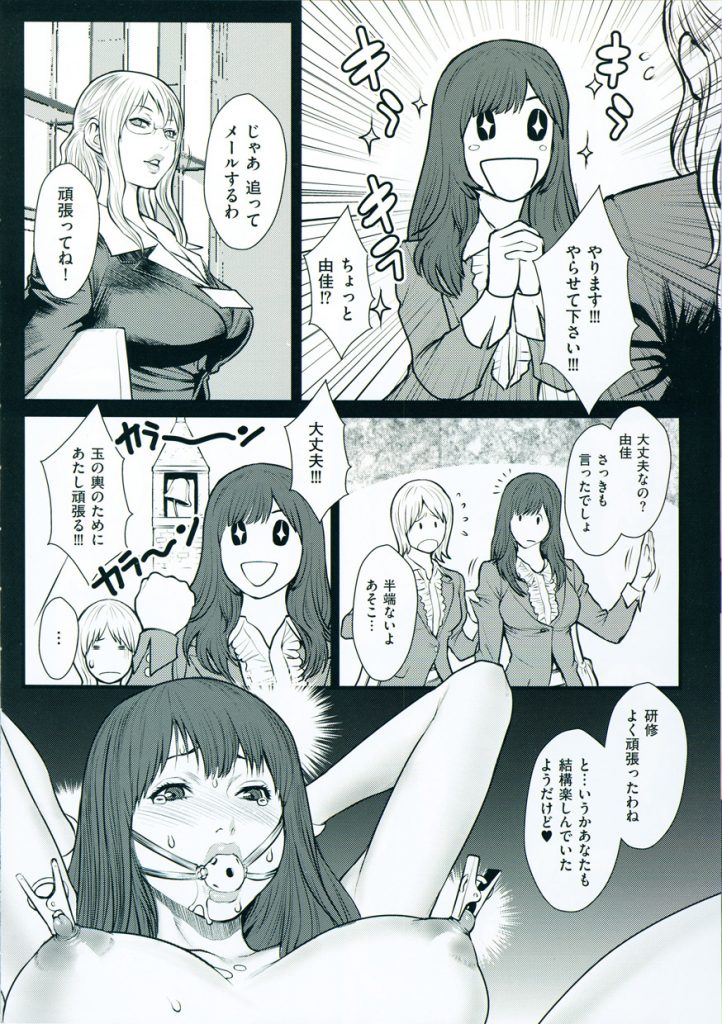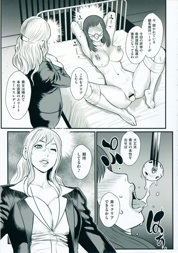 【エロ漫画】研修最終日になった巨乳会社員…拘束され猿轡を着けてバイブを挿入されていた!【戦闘的越中:社内調教】