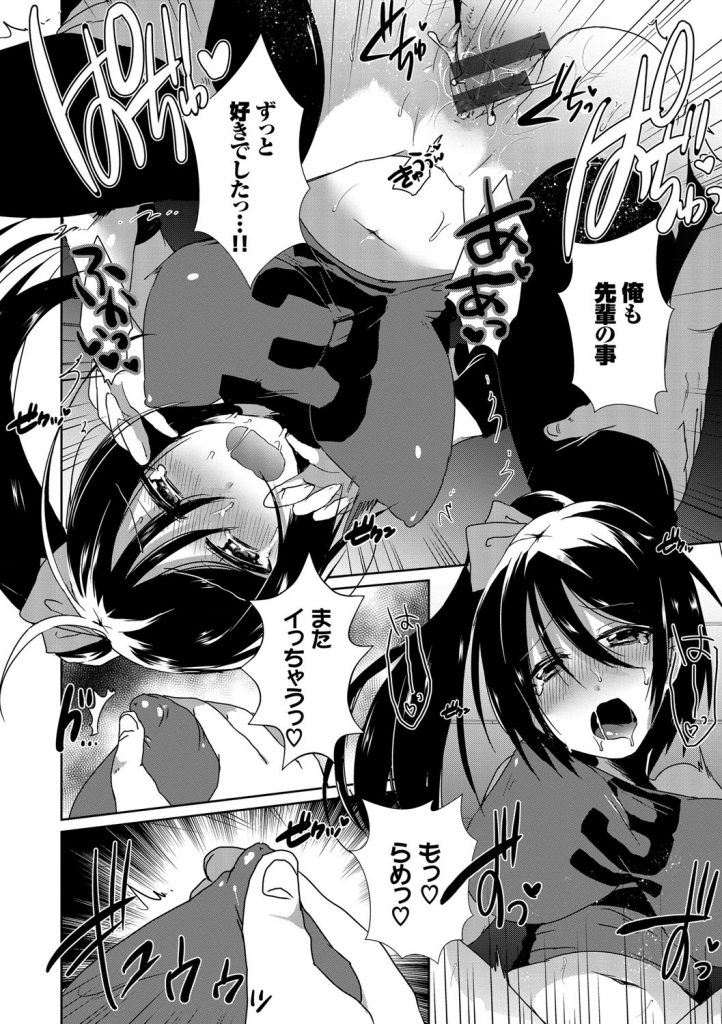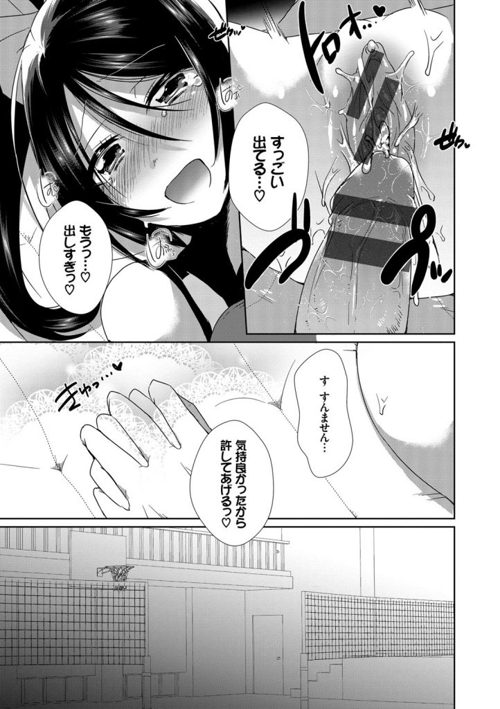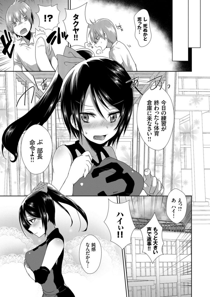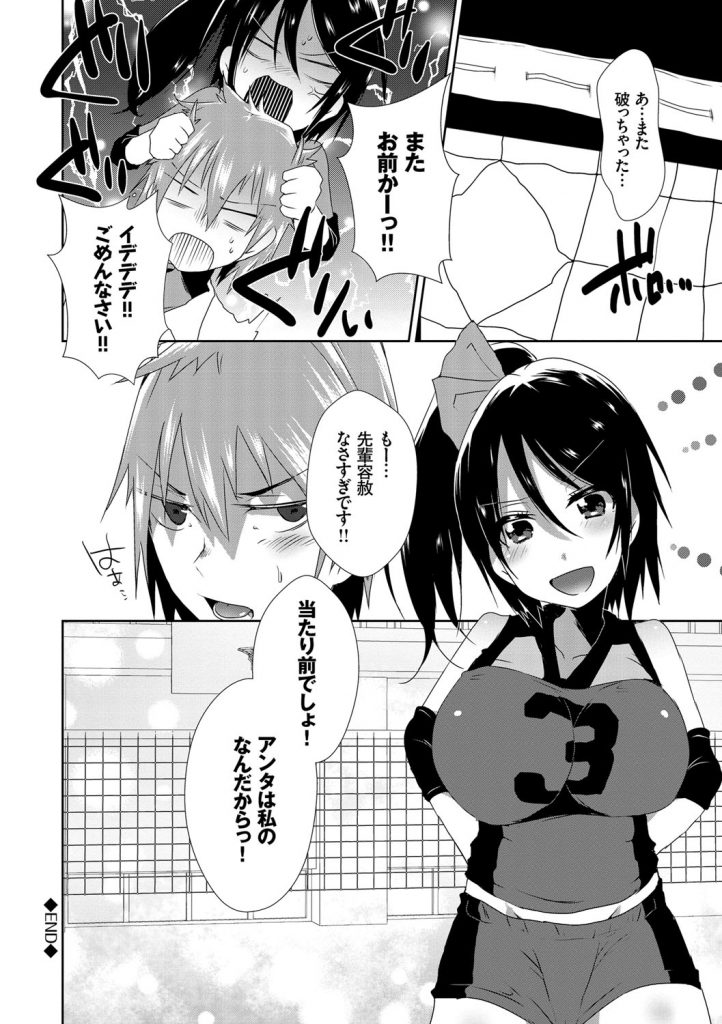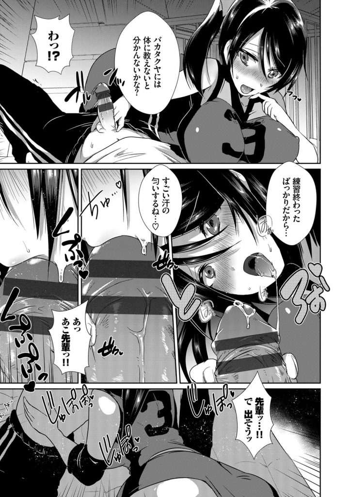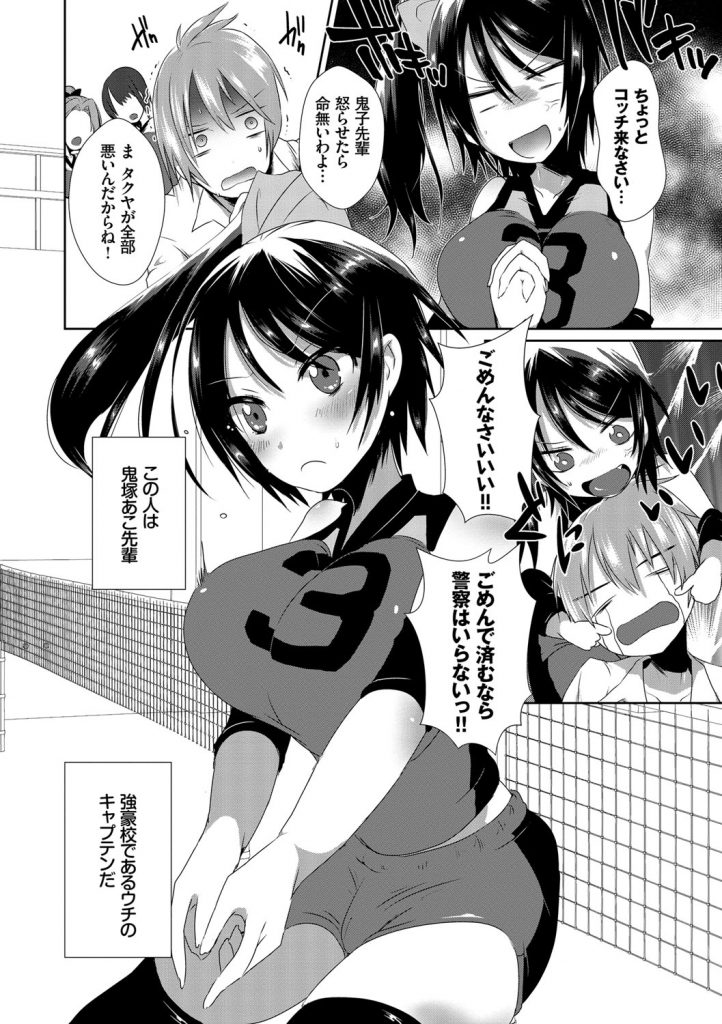 【エロ漫画】練習後に後輩男を体育倉庫に呼び出し押し倒すバレー部の厳しい巨乳主将J…好きだと言って巨乳触らせ勃起チンポフェラチオ口内射精をして手マン掻き回し責め処女マン挿入腰振り中出しセックス【海老名えび:ひみつのトレーニング】